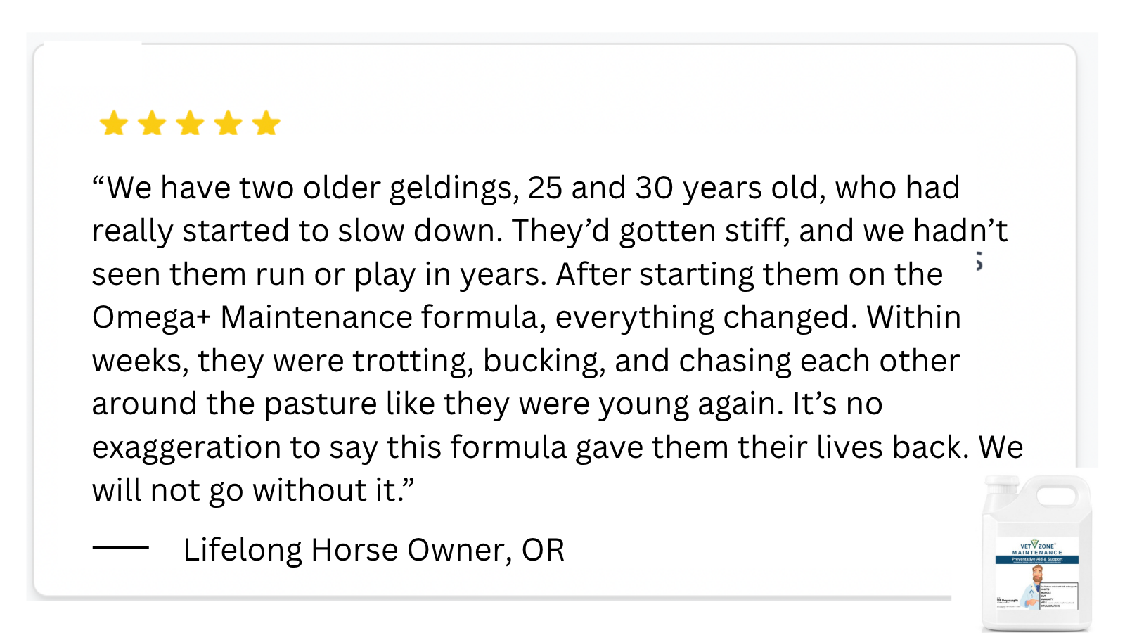 Unlike generic supplements, VetZone products are oxygen-activated and developed with veterinary-grade precision. They're safe enough for our own animals, and effective enough for the toughest cases.